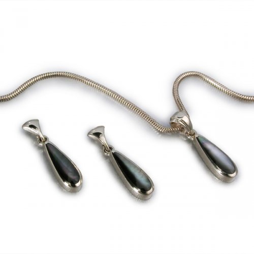 The unusual and lesser-known black Mother of Pearl stone is used here in a set of earrings and necklace with a slim droplet design. This is a set that will suit any age woman and will look equally good with formal or more casual clothing. Classic jewellery made by master craftsmen which will last for a lifetime.