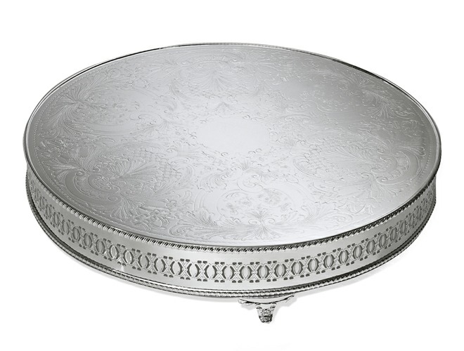 Silver plated, intricately patterned, round wedding cake stand. This will make the big day even more special and will hold memories for the happy couple for long after the event.