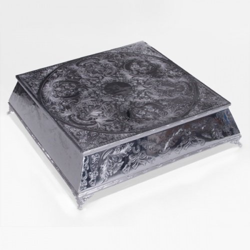 This silver plated, square wedding cake stand has interesting flared sides and an intricate design engraved on the top and sides. Heavy and robust enough to last for years.
